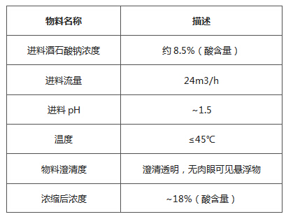 離交工藝后得到的酒石酸進(jìn)行濃縮,產(chǎn)水回用。PH約為1.5,濃度8.5%(含酸量),料液澄清透明,無(wú)肉眼可見(jiàn)懸浮物,濃縮后濃度約為18%(含酸量)。原料液情況如下: